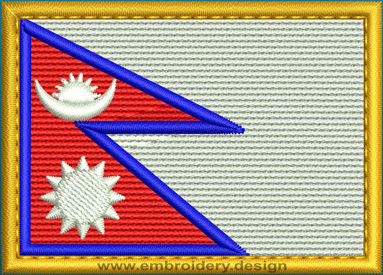 This image clearly demonstrates how the design embroidery Nepal Rectangle Flag with a Gold Border will look like at a specific form of clothes or fabric under defined angle.