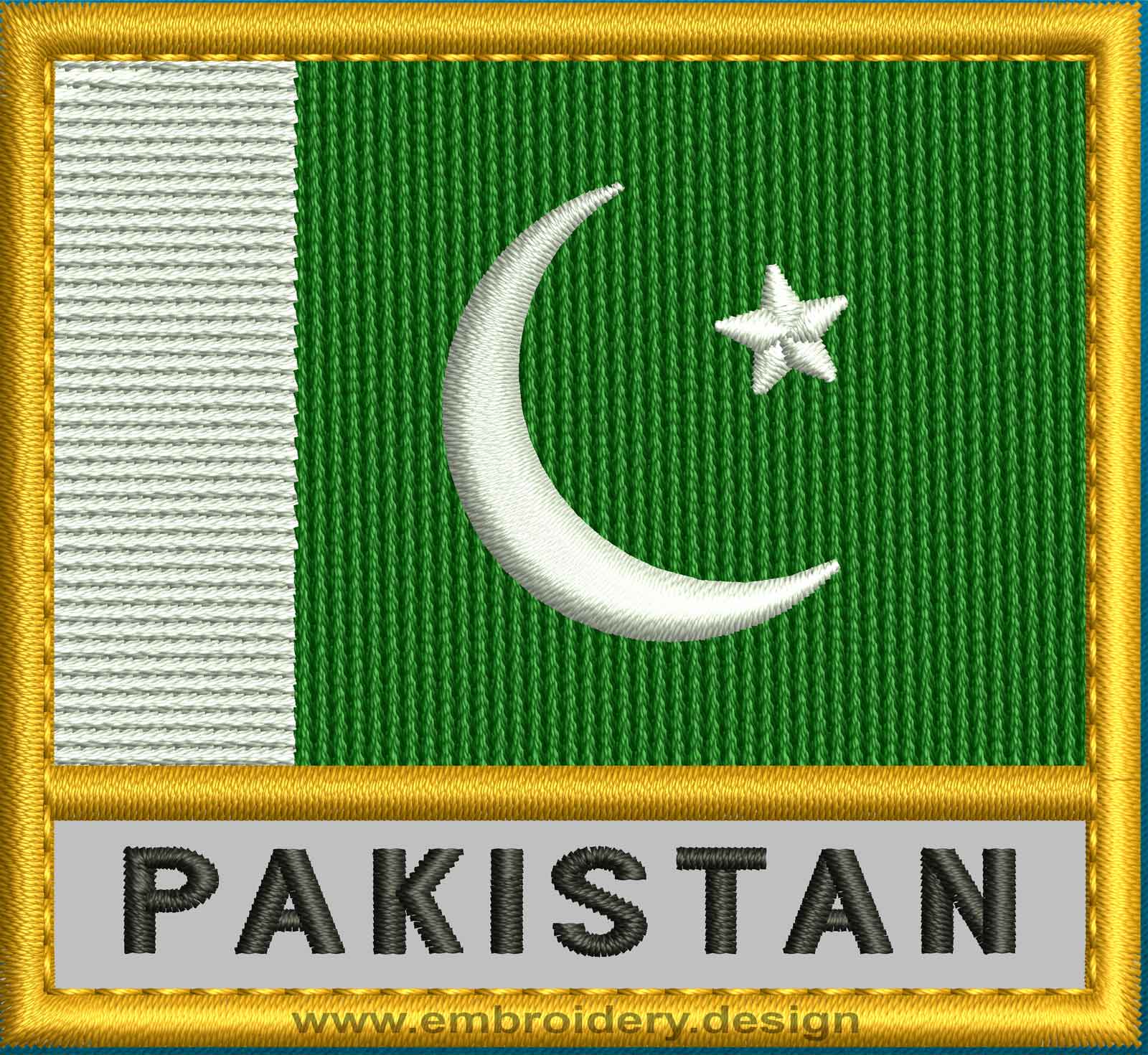 This picture illustrates is how design embroidery Pakistan Text Flag with a Gold Border will look on a specific with clothes or fabric under a certain angle.