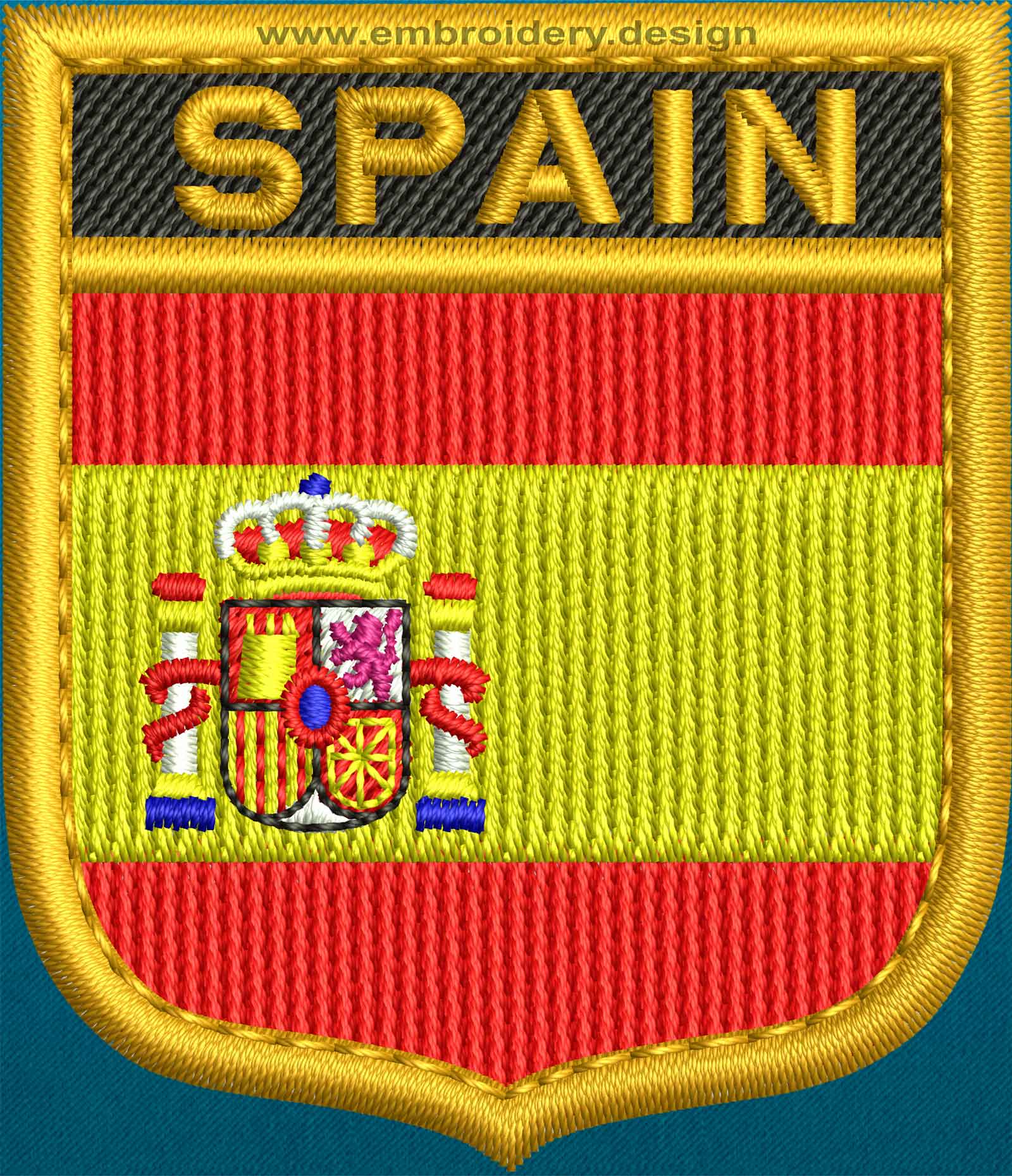 This picture illustrates how the design embroidery Spain Shield Flag with a Gold Border will look like at a specific with clothes or fabric under selected angle.