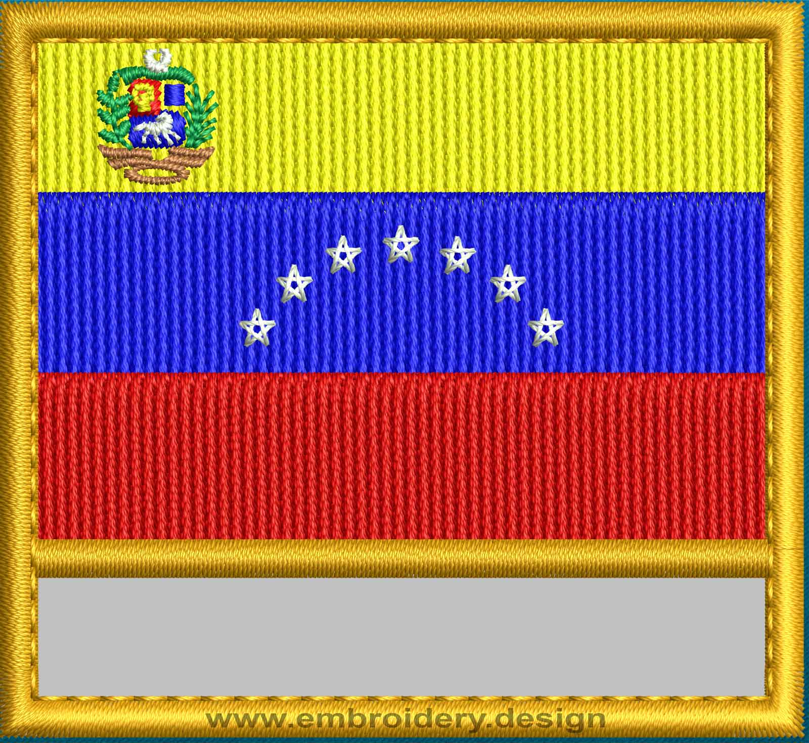 This picture demonstrates is how design embroidery Venezuela (With Crest) Customizable Text Flag with a Gold Border will look like at a specific with clothes or fabric under specific viewing angle.